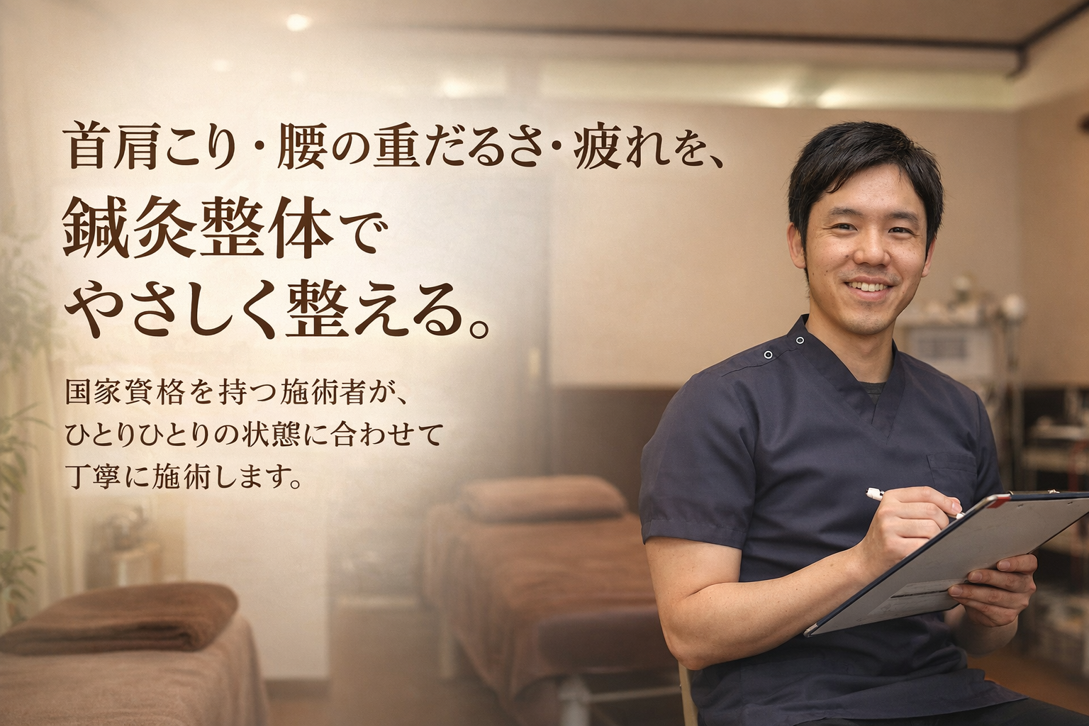 鍼で硬くなった筋肉のこりをほぐす施術が中心ですが、症状によっては整体を行う場合もあります。